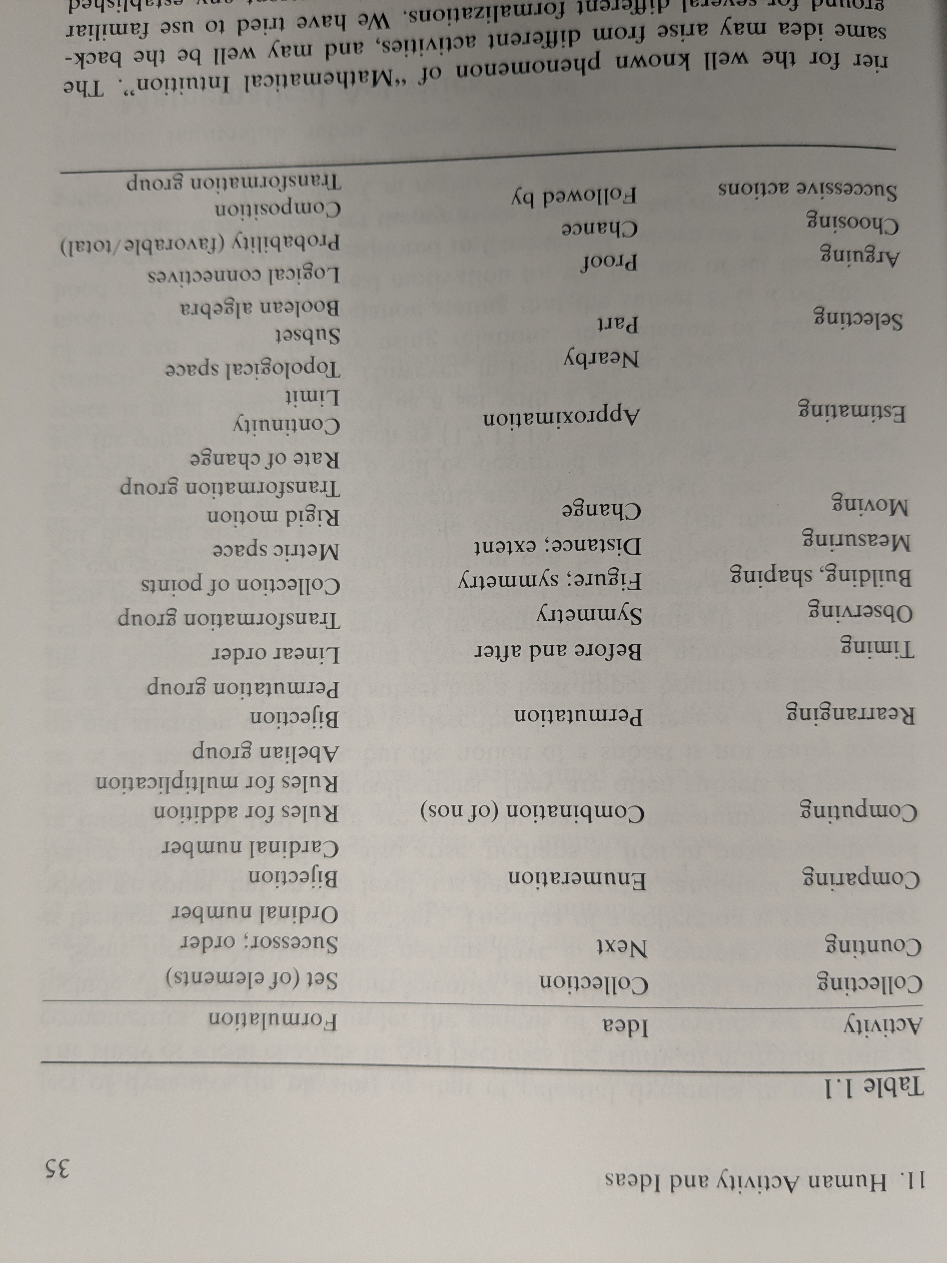 The following table is from MacLane’s book ``Mathematics: Form and Function’’, illustrating this progression for different human activities.[Mathematical] activities... involve counting, timing, measuring, and moving, using numbers, intervals, distances, and shapes. Facts about these operations and ideas are gradually assembled, calculations are made, until finally there develops an extensive body of knowledge, based on a few central ideas and providing formal rules for calculation. Eventually this body of knowledge is organized by a formal system of concepts, axioms, definitions, and proofs.