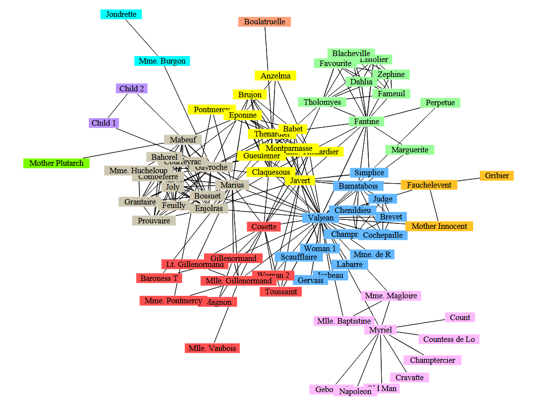 As another example of a network that is frequently studied using community detection algorithms, here is the network of characters in Victor Hugo’s novel "Les Misérables".